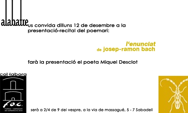No us perdeu la presentació de L’enunciat, de Josep-Ramon Bach, a la seva ciutat, Sabadell. Serà el dia 12 de desembre, a 2/4 de nou del vespre a la Via Massagué, 5-7, de Sabadell. Presentarà l’acte el poeta Miquel Desclot, i Bach llegirà alguns dels seus micro-poemes, o poemes-aforisme, o…