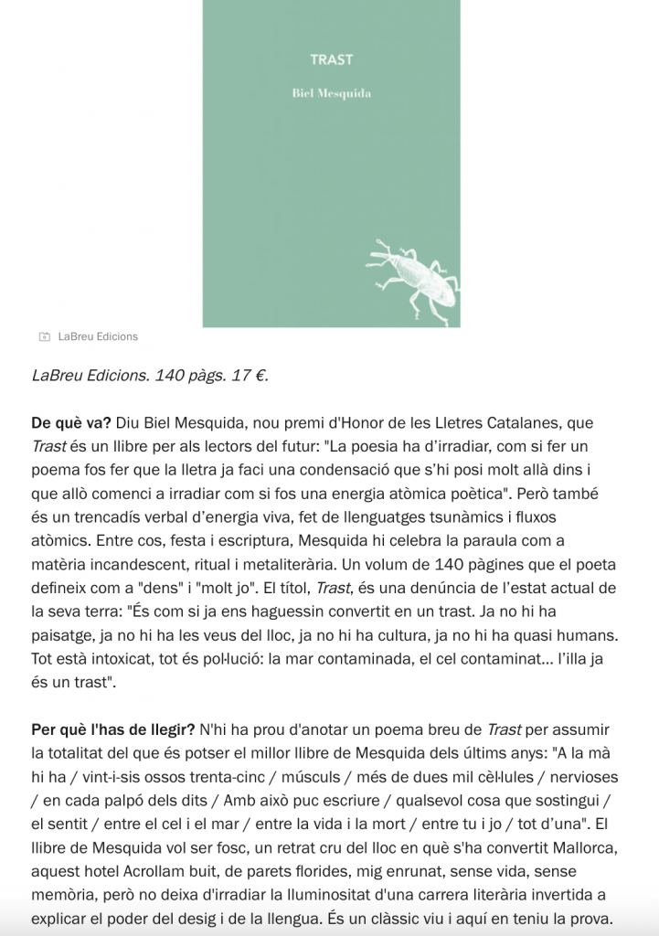 Amb Trast, acabat de sortir del forn de la factoria LaBreu Edicions en un vintè aniversari que està assolint un munt de reconeixements, Biel Mesquida signa un dels llibres més pletòrics i necessaris de la seva trajectòria, una obra poètica que arriba en el moment just: després del merescudíssim reconeixement del premi d’Honor de les Lletres Catalanes, però també en un període sociològic i polític de grans turbulències mundials, amb un nefast retorn a tendències d’ultradreta que ens haurien de preocupar molt més. Trast és un manifest, una abrandada proposta textual que ens rebenta a la cara per recordar-nos que la veu d’aquest creador pancatalà és fonamental car fa fonament i, a més a més, es troba en plena combustió catalitzadora, en furibund carnatge. Aquest nou volum fet de versos exaltats és una explosió de ràbia lúcida i d’energia reivindicativa que no concedeix treva: un poema llarg i torrencial fragmentat en vuit cants que sorgeix d’una urgència gairebé física i que es desplega ben igual que una font ufana que no deixa de rajar fidel a l’impuls propulsador. Aquí la cruel bellesa no és evasió sinó lloc sagrat des d’on s’alcen exigències de radical justícia que es diuen amb tots els noms i totes les cicatrius, tant les del cos com les de l’esperit. Biel Mesquida estableix un diàleg tens i vibrant amb els desajustos de la Història. La consciència perceptiva, sempre afinadíssima, es veu travessada per les injustícies que sagnen, tant les heretades com les d’ara, com si la guerra (in)civil del 36 no s’hagués tancat del tot. Trast és, en aquest sentit, una polifonia de rebel·lia però també de revelació: el títol mateix condensa una diagnosi devastadora del present, d’un paisatge illenc convertit en residu, d’un temps massacrat en què el territori, el llenguatge i el costum semblen dissoldre’s sota el pes de perversions materials i simbòliques. I, tanmateix, lluny de qualsevol temptació apocalíptica, la poesia de Mesquida no es resigna, s’atreveix a continuar irradiant potències lingüístiques que reactiven sensibilitats i sacsegen memòries fins a fer-les de nou incisives, crítiques, vives. Hi ha en aquest volum quintaessencial una densitat temerària, una personalitat definida que es nega a clausurar-se tot escorxant-se de pinte en ample: cada vers està escrit al límit, amb una intensitat que convida a llegir amb tots els forats oberts. En diàleg amb peces majors de la seva obra talment el poema ‘Sgt. Pepper Wants You: Auca’, el mosaic que és Trast reprèn i multiplica la capacitat de fer confluir èpica i barbàrie, cultura i experiència, collage i càntic en un flux que és alhora tradició i postmodernitat. El resultat és un artefacte extraordinari que cavalca entre segles i registres, i que confirma Biel Mesquida com un creador imprescindible: un escriptor que escriu i que transforma la llengua en una força capaç de resistir, denunciar i somniar.