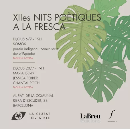 recital de Maria Isern, Jèssica Ferrer, Chantal Poch a Sants (20.07.23) ester 3 anys ago Dijous 20, a les 19 h, dins la progamació del cicle NITS POÈTIQUES A LA FRESCA recital de Maria Isern RUSC Jèssica Ferrer SOM AQUÍ Chantal Poch CREMAVEN al Pati de la Comunal (c/Riera d’Escuder, 38 Barcelona) organitza La Ciutat Invisible