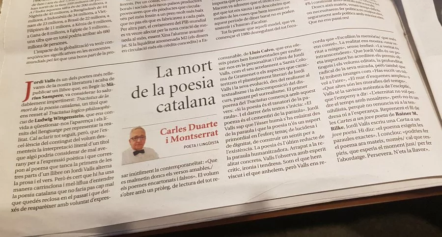 Jordi Valls és un dels poetes més rellevants de la nostra literatura i acaba de publicar un llibre que, en llegir-lo Màrius Sampere, va considerar-lo saludablement impertinent: Tractatus de la mort de la poesia catalana, un títol que ens remet al Tractatus logico-philosophicus de Ludwig Wittgenstein, que ens convida a qüestionar-nos l’aparença i els límits del llenguatge per representar la realitat. Cal aclarir tot seguit, però, que l’excel·lència del contingut del volum desmenteix la interpretació literal d’un títol que algú podria considerar de mal averany per a l’expressió poètica i que correspon al poema que tanca la primera de les tres parts d’un llibre on Jordi Valls alterna la prosa i el vers. Però és cert que hi ha una manera carrinclona i mel·líflua d’entendre la poesia catalana que no faria pas cap mal que quedés reclosa en el passat i que deixés de reaparèixer amb voluntat d’expressar inútilment la contemporaneïtat: “Que es malmetin doncs els versos amables,/ els poemes encartonats i falsos”. El volum s’obre amb un pròleg, de lectura del tot recomanable, de Lluís Calvo, que ens ofereix pistes ben fonamentades per endinsar-nos en la personalitat i l’obra de Jordi Valls, com el seu arrelament a Santa Coloma de Gramenet o els aspectes que caracteritzen el plantejament literari de Jordi Valls i la seva evolució, des del realisme al textualisme i la descomposició del discurs, passant pel surrealisme. El primer poema del Tractatus comença amb aquest vers: “Si la poesia és el tanatori de la paraula”. I el darrer dels textos s’inicia: “El poema és el cementiri de la paraula.” Jordi Valls sap que l’ésser humà s’ha enlairat des de la paraula i que la poesia n’és un suport primordial en l’esforç tenaç de lucidesa i de dignitat, de construir un sentit per a l’existència. La poesia és l’últim reducte de la paraula humanitzadora. Arrapat a la realitat concreta, Valls l’observa amb esperit crític, ironia i tendresa. Som el que hem viscut i el que anhelem, però Valls ens recorda que “Escollim la memòria/ que més ens convé”. La realitat ens mostra “una veritat a mitges”, sense èmfasi: “La veritat és intranscendent”. Que Jordi Valls és un poeta important ho acrediten els premis obtinguts i els volums editats, la profunditat radical de la seva mirada, però també que hi trobem imatges com “Has escrit un núvol a l’aire”, “El mar d’esquenes amples” o “Que altes són les muralles del temps”. Valls té la saviesa autèntica de l’escèptic, que l’empeny a dir: “L’eternitat no vol perdre el temps amb nosaltres”, però no és un nihilista, perquè no renuncia ni a la tendresa ni a l’esperança. Reprenent el fil de les Cartes a un jove poeta de Rainer M. Rilke, Jordi Valls escriu una Carta a un jove poeta. Hi diu: “el poema exigeix les paraules exactes”. I conclou: “podries fer el poema ara mateix, només/ cal que respiris, que esperis el moment just/ per fer l’abordatge. Persevera. N’ets la llavor”.