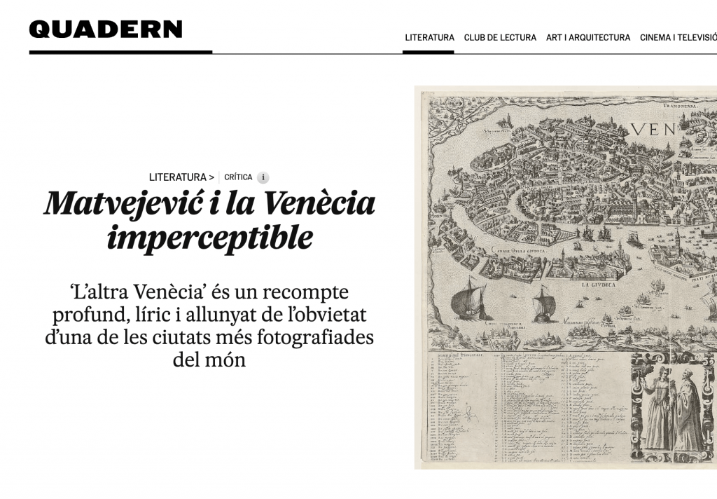 «Predrag Matvejević (1932-2017) es mirava la ciutat de Venècia des de l’altra banda del Mar Adriàtic. Matvejević va néixer a Mostar (aleshores, Iugoslàvia), de mare croata i pare russòfon, i va estudiar lletres franceses a la Universitat de Sarajevo i el darrer curs a la de Zagreb. Per al doctorat es va traslladar a la Sorbona. Va acabar la tesi, sobre el compromís social de la poesia, un any abans del Maig del 68. Retornat a Zagreb hi va ensenyar literatura fins que el 1991 va esclatar la guerra entre Croàcia i Sèrbia. Mentre feia classes a diverses facultats europees va ser capaç d’escriure llibres erudits, llibres literaris i llibres eruditament literaris. En el camp plenament polític, va comprometre’s amb els drets humans i la cultura de la pau, exercint la vicepresidència del PEN Internacional a Londres, i també va presentar-se a les eleccions europees amb el Partito dei Comunisti Italiani. En els seus llibres el Mediterrani és crucial: és a dir, és la cruïlla de camins del territori compartit, és l’àgora on es fa mercat i trobada…»